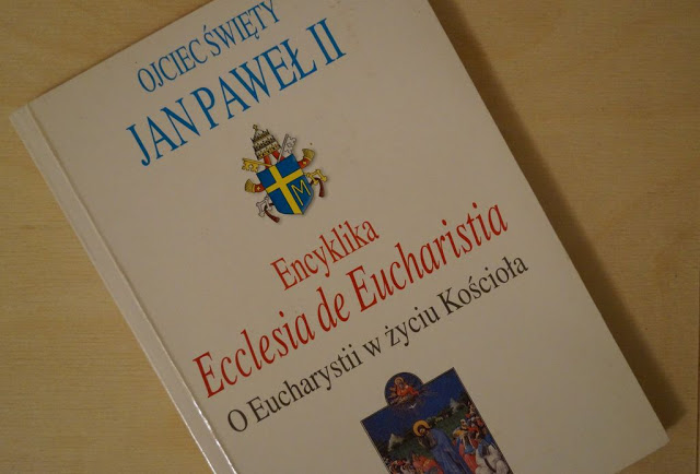Ostatnia Encyklika św. Jana Pawła II nosi tytuł “Ecclesia de Eucharistia” i poświęcona jest właśnie Eucharystii. Jej pierwsze zdanie streszcza wszystko: “Ecclesia de Eucharistia vivit”, co znaczy: “Kościół żyje dzięki Eucharystii“.